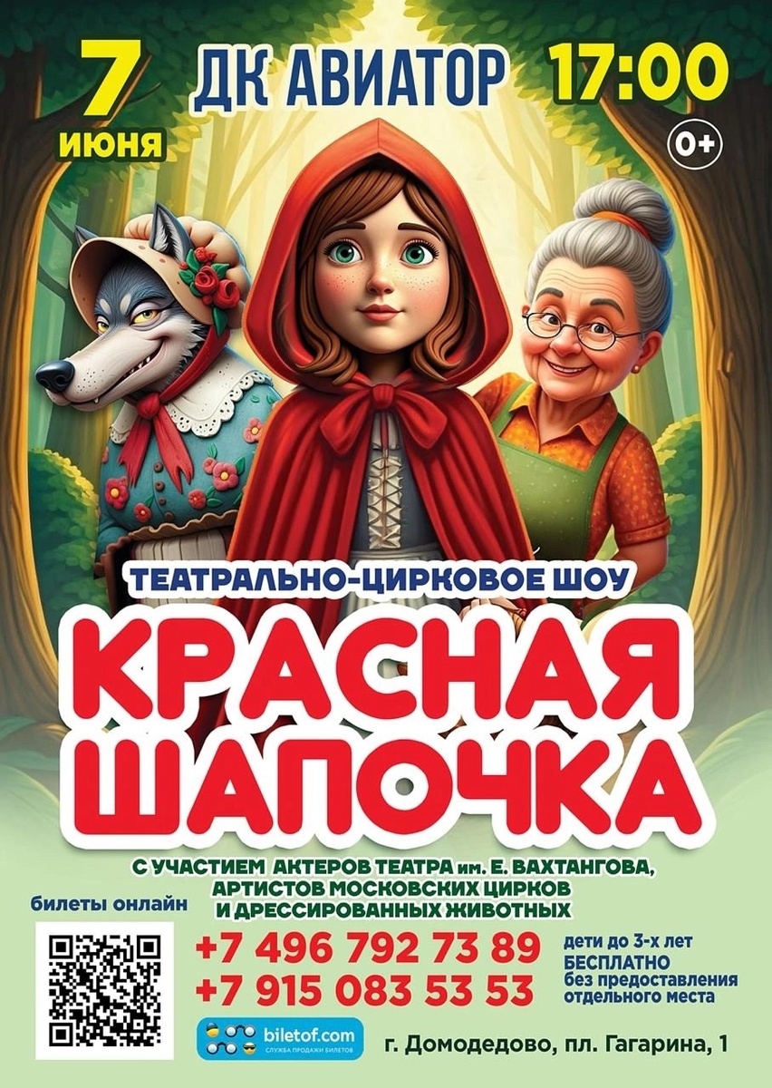 ✨ «КРАСНАЯ ШАПОЧКА» Театрально-цирковое шоу для всей семьи, с участием артистов театра им. Е. Вахтангова, артистов Московских цирков и дрессированных животных. Все мы с детства знакомы с персонажами сказки «Красная шапочка». Попав на наш цирковой спектакль, вы окажетесь в чудесном мире с невероятными приключениями и удивительными превращениями. В нашем необычном лесу вы познакомитесь с новыми героями, которые неожиданно будут появляться на пути Красной шапочки. 🚫 Возраст: 0+ 📆 07.06.2025🕒17:00 🏢 Городской дом культуры «Авиатор» 📍 г. Домодедово, ул.Гагарина, д.1 🎫 Купить билет: https://new.biletof.com/choose/?ra=15885&elem=0&var=2&frame=1 ✅ Мероприятия Домодедово https://dzen.ru/id/66f10385cc4c5a16f7b5fb02 http://vk.com/domodedovo_events http://dzen.ru/domodedovo_events