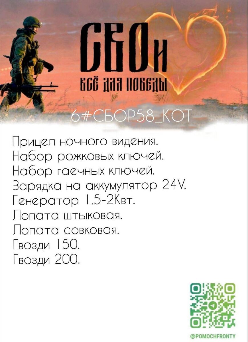 ⚡️⚡️🐍🐍🐍🐍 для Кота 1. Генератор. 18 545 https://ozon.ru/t/5zQQS8k 2. Гвозди 150, 20кг* 85р=1700 3. Гвозди 200, 20кг*85р=1700 4. Набор ключей 3347р https://ozon.ru/t/zD11gwg 5. Набор головок 6477 https://ozon.ru/t/vIqqNzS 6. За зарядка на аккумулятор 2795 https://ozon.ru/t/teAA4cY 7. Тепловизионный прицел с кронштейном - 69 927 https://ozon.ru/t/MuEftoS ( ловить Бабку Ежку и не только) 8. Аптечка 3шт*1600=4800 9. Напашник 3шт *2500=7500 10. Лопата штыковая 12. Лопата совковая ❗️Сумма сбора: 116 791 (без учета лопат) 💳 Реквизиты: Помочь СВОим ФРОНТ Т-Банк: 2200701225452439 Тел. для перевода по СБП (Т-Банк): 89936125765 Юлия Ф./Иван П. ⚠️Вы можете самостоятельно заказать любую позицию на пункт выдачи Горки-2, д 11. В случае самостоятельного заказа - напишите об этом в чате.