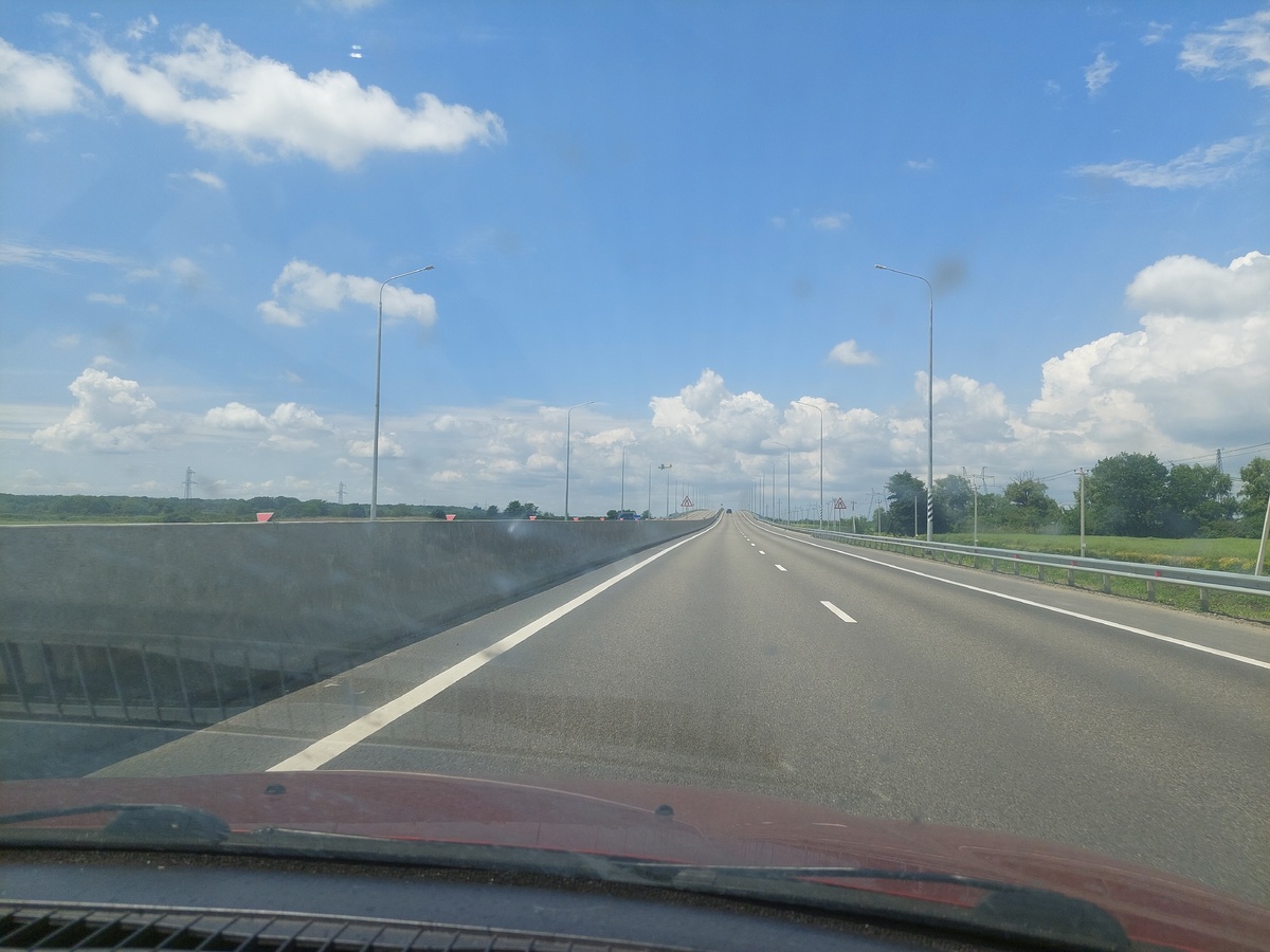 Краткий отчёт второго дня пути. Старт в 8:20, прибытие в Широкую Балку в 14:50, 520 км (две остановки для смены водителей, включая одну заправку), в Дивноморское ещё плюс 60 км, итоговый расход за два дня 6,3 литра/100 км. Ехали по М-4 до Краснодара, дальний западный обход (ДЗОК), новая дорога до моста А-289, Анапа, Новороссийск. Так как очень хотелось посмотреть А-289, то получился перепробег в 70 км. Но при прямой дороге перед Крымском есть очень неприятный ж/д переезд, а после Крымска до Новороссийска настолько плотное движение, что обгоны не имеют особого смысла. Поэтому более долгая по расстоянию дорога, на мой взгляд, более комфортна, несмотря на незавершенную реконструкцию от Белого до обхода Анапы. ДЗОК пустой, как и в прошлом году, А-289 тоже пустая. Стоимость проезда всех платных участков преодолела 5000 руб. в понедельник-четверг, и вплотную приблизилась к 6000 руб. в пятницу-воскреаенье (с расширением на праздники). На фотографиях: - А-289 (в небе "кукурузник" Ан-2