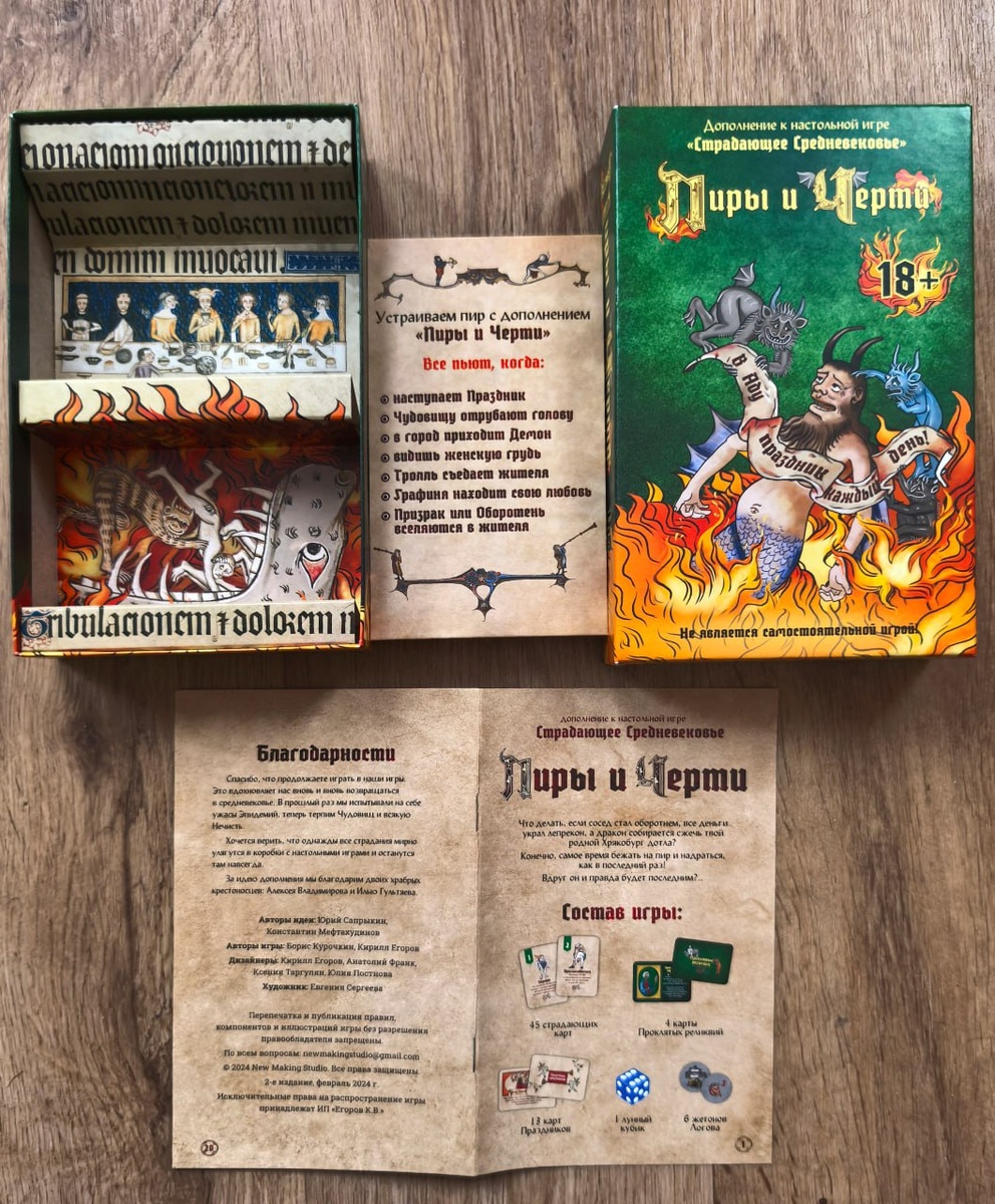 Эпидемии закончились, но страдания только начинаются! Жители средневековых деревень вышли, чтобы отпраздновать, но на звуки слетелась вся нечисть. Ещё и дракон нападает на город. Нездоровая атмосфера! Найдется ли в городе герой, готовый сразиться с чудищем? Или проще скормить ему пару крестьян и спать спокойно? Решение за вами, о, мудрый правитель Говенбурга! Пока одни ругали настолку от «Страдающего» как игросодержащий продукт, а у других она получила чуть ли не культовый статус, сам паблик выпустил к оригинальной игре пару дополнений. Первое и позорное — «Омерзительное средневековье». Это колода добавляющая в игру мемных персонажей которых стоило добавить в базовую версию, а не продавать отдельно слишком уж противных, чтобы войти в основной состав оригинального издания. Второе и во всех смыслах не стыдное — «Пиры и черти». Оно добавляет новые карты и даже новые типы карт и механики. Точнее, заменяет механики оригинальной игры. Создатели рекомендуют играть в «Пиры и черти», предвари