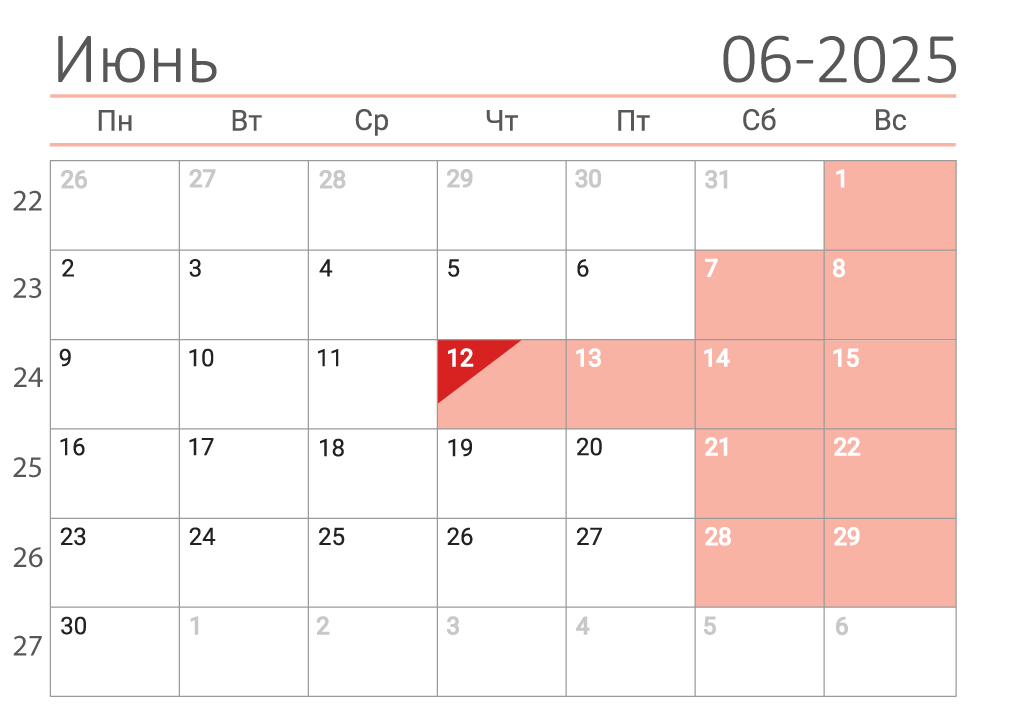 - Официальный праздничный выходной: 12 июня (четверг) – День России.