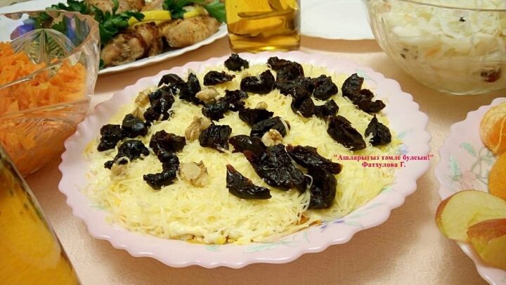 Бик тәмле салат рецепты тәкъдим итәбез: - пешкән тавык ите; - кыздырылган суган + кишер; - пешкән йомырка (кыргыч аша); - сыр (кыргыч аша) ; - әстерхан чикләвеге ; - кара җимеш. Һәр катлам саен майонез сылана. P.S. Майонезны сметана, йә йогуртка (чиста, Е сыз) алыштырырга була. Салатны биек итеп түгел,юка катламлы итеп ясыйбыз. Автор: Гөлчәчәк Фатхулова Автор фотосы