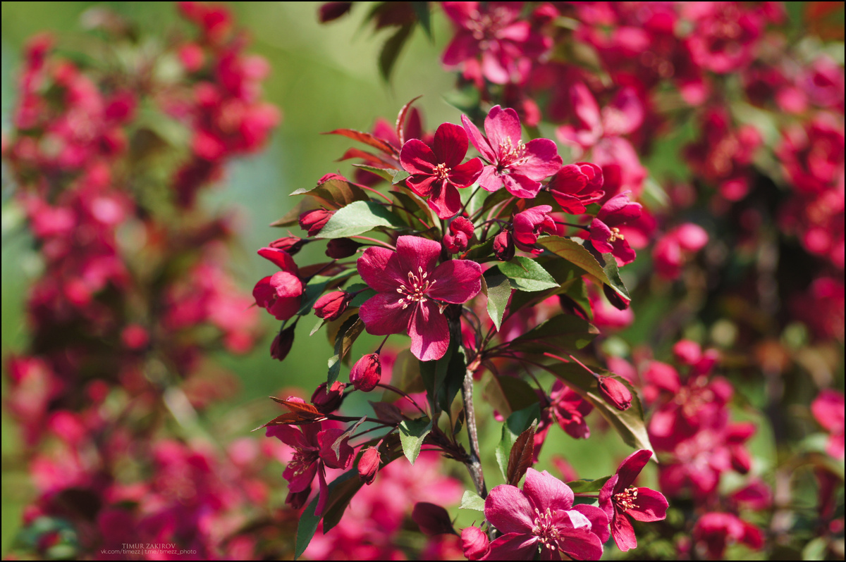 Фотостатья в 2х частях, 21 фотография. В конце - короткая ботаническая справка. Статья скорее про впечатления от созерцания красоты, чем про вид дерева и его использование. Некоторые фото объединены в галереи по несколько штук, не пропустите, листайте вправо. Годами я снимал эти выделяющиеся деревья в одном известном мне месте, мы называли их "сакурами", прекрасно понимая, что они яблони, а сакура - это вишня (неправильно, зато понятно, если только друг с другом использовать). Радовался цветению каждый год, но цветы почему-то становились все тусклее, может быть с возрастом, а может и по каким-то другим причинам. Потому я обязательное паломничество к ним завершил лет 5 назад. И тут едем через частный сектор, достаточно недавно выстроенный дом - молодая яблонька просто огнем розовым горит, ярче любой краски на любом заборе! Друзья не дождались, уехали медленно вперед, а я стоял и снимал, последовательно меняя 4 разных объектива, игнорируя прожженную солнцем спину и лай верного хозяевам о