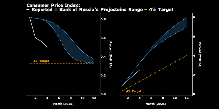 Однако такое решение, даже если оно и будет принято, не станет началом полноценного цикла смягчения ДКП. Возможно, Банк России пойдет на риск более резкого замедления экономики ради снижения инфляции, предупреждает экономист Bloomberg Economics Александр Исаков. Потребительская инфляция в РФ: белым — официальные данные, голубым — прогнозы Банка России, оранжевым — целевой уровень Банка России. Слева: % м/м, справа — накопленная с начала года инфляция. Источник: Bloomberg Инфляция в России снижается, рубль укрепляется, а рост кредитования замедляется: эти три фактора указывают на то, что Банк России может смягчить денежно-кредитную политику на заседании 6 июня. Мы ждем, что ключевая ставка будет снижена с 21% до 19%, однако такое решение, даже если и будет принято, не станет началом полноценного цикла смягчения. Банк России стремится восстановить свою репутацию после четырёх лет, на протяжении которых ему не удавалось удержать инфляцию в пределах целевого уровня в 4%, поэтому, возможно,