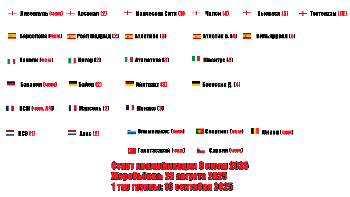 Лига Чемпионов не даёт нам скучать и удивляет в очередной раз, ведь Англия получила 6 мест: Это чемпион страны Ливерпуль, вторая команда премьер-лиги Арсенал, отставшая от лидера на 10 очков, бронзовый призёр Манчестер Сити, обладатель четвёртого места Челси. Ньюкасл занял пятое место по итогам чемпионата Англии и пробился в Лигу Чемпионов, поскольку две лучшие ассоциации получили дополнительные места. И одно из дополнительных место получила Англия и выдвинула в основной этап своего представителя Ньюкасл. А шестой британской командой стал Тоттенхэм, победивший в финале Лиги Европы. Как известно, победители того турнира автоматически попадают в Лигу Чемпионов. В этом сезоне в еврокубках не увидим Манчестер Юнайтед. Испанская ассоциация получила в следующем сезоне 5 мест, одно из которых также дополнительное. Итак, Барселона – чемпион страны, Реал Мадрид финишировал вторым, проиграв Барсе 4 очка, бронзовый призёр Атлетико, Атлетик Бильбао стал четвёртым, а Вильярреал получил ту самую доп