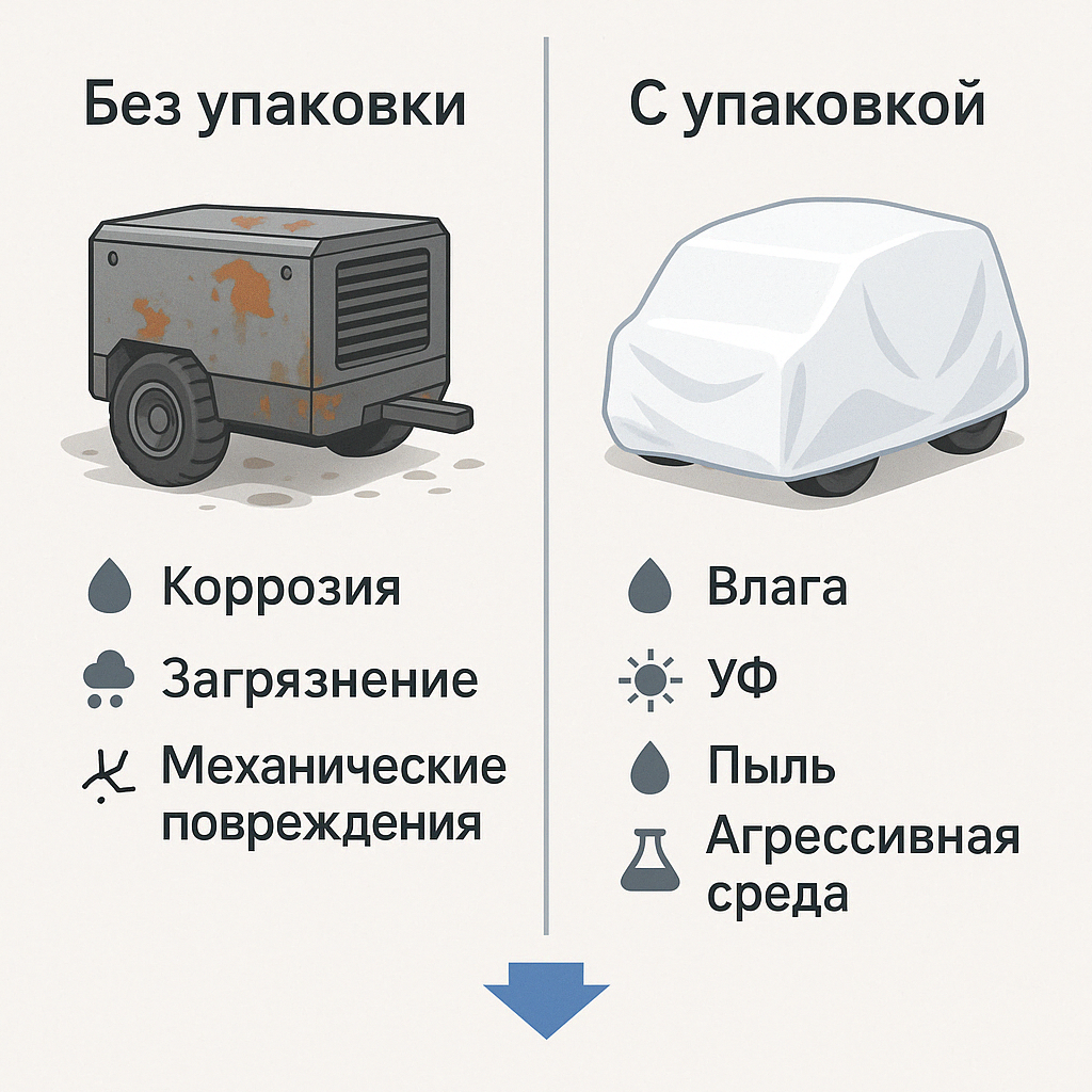 С задачами консервации оборудования могут столкнуться как производственные предприятия, так и производители самой техники. Причины для этого различны: на производстве потребность в консервации может возникнуть при временной остановке линии, ремонте цеха или транспортировке оборудования на другую площадку. У производителя оборудования необходимость в защите продукции возникает при длительной транспортировке до заказчика или при хранении на складе в ожидании отгрузки. Сценариев, при которых требуется консервация, довольно много. Поэтому важно понимать не только цель, но и методы реализации этого технологического процесса. Основная задача консервации – сохранить изделие в исходном состоянии, не допустить изменений внешнего вида и утраты функциональных свойств. Наиболее частой причиной деградации является воздействие влаги и других агрессивных факторов окружающей среды. Стальные элементы особенно уязвимы: они подвержены атмосферной коррозии, которая может повлиять не только на внешний ви