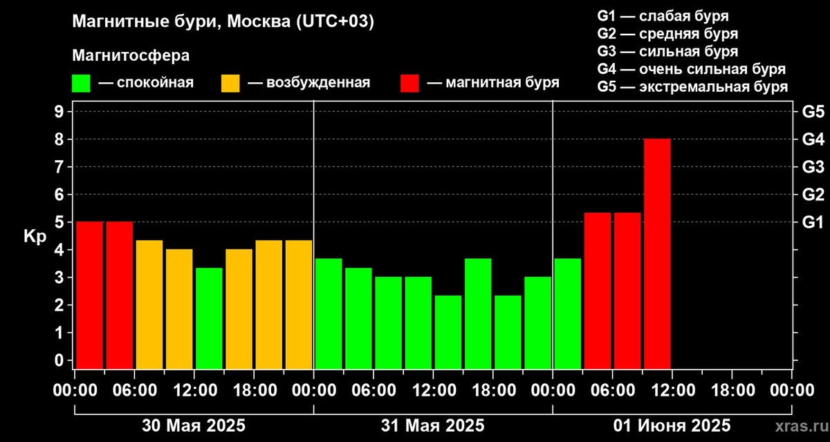 Облако плазмы, выброшенное Солнцем накануне во время вспышки, почти на сутки раньше прогноза дошло до Земли. В полдень 1 июня магнитная буря достигла предпоследнего уровня мощности G4 и оценивается как очень сильная, сообщается на сайте Лаборатории солнечной астрономии ИКИ РАН и ИСЗФ СО РАН. Уровень G4 предполагает, что на Земле могут наблюдаться помехи в связи, возникать сбои в работе навигационных систем. Кроме того, полярные сияния могут наблюдаться даже в тропиках. Не исключено, что магнитная буря может усилиться и достигнуть высшего уровня G5.