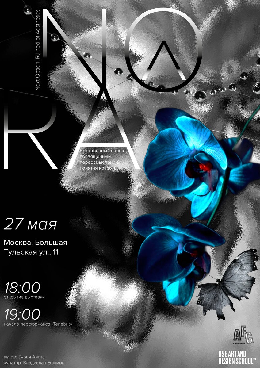 NO^RA (Next Option: Ruined of Aesthetics) – персональная дипломная выставка, посвященная переосмыслению понятия красоты Обращаясь к тенденциям в современном потребительском обществе, данная работа развивает тему бесконечного стремления к красоте и невозможности достичь идеала, выявляет впечатляющий баланс и выразительные контрасты между понятиями «прекрасного» и «ужасного». Выставка NO^RA — результат поиска и экспериментов с гармонией и хаосом, с тем, к чему сейчас принято стремиться и тем, чего принято избегать. Фотоальбом по ссылке: Автор: Анита Бурая Куратор: Владислав Ефимов Art Future Gallery, Москва, Большая Тульская ул., 11