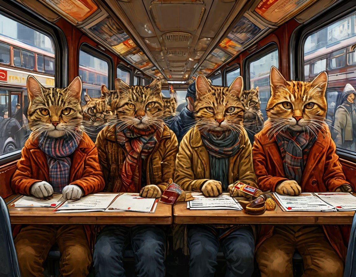 Я написала: «Салон автобуса, люди в салоне, полосатый кот-контролёр продаёт билеты пассажирам».