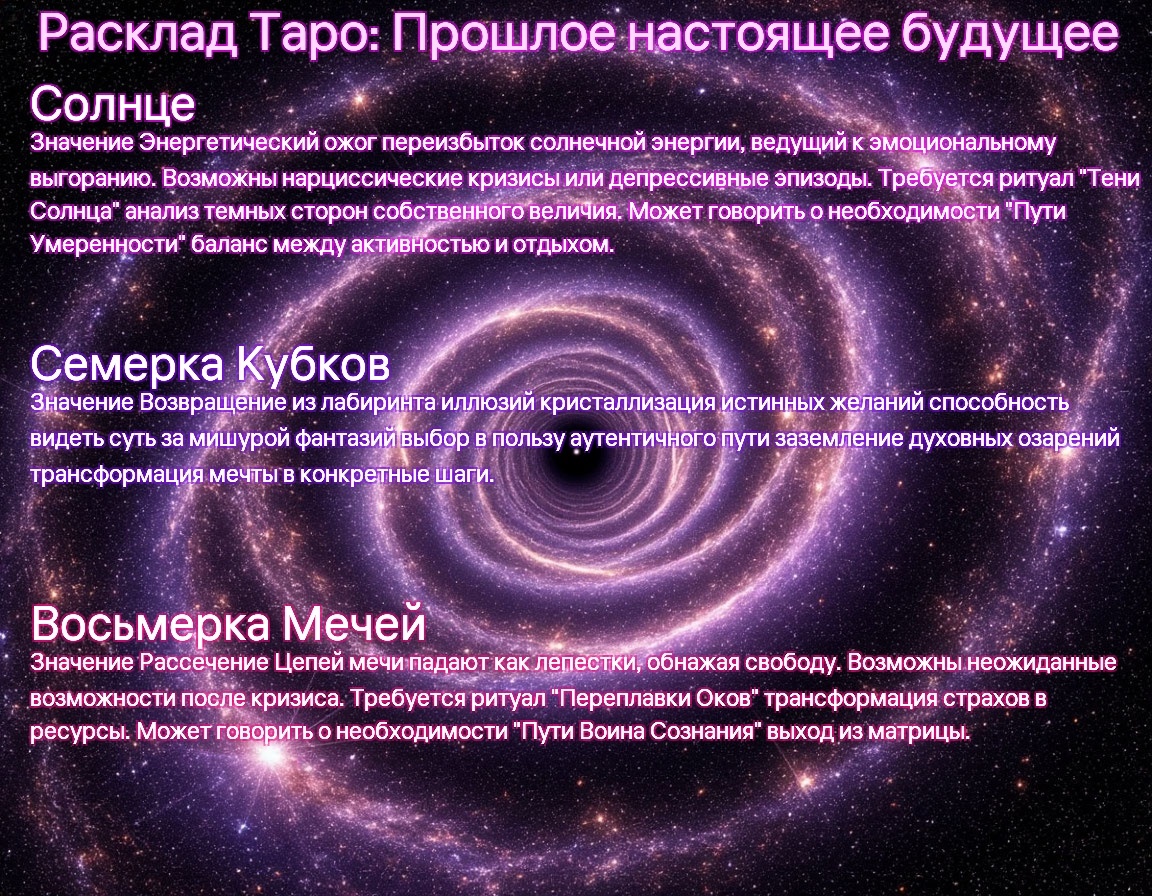 ✨ Дорогие читатели, этот расклад — ваш компас в путешествии к себе. Делитесь своими мыслями в комментариях: какие эмоции вызвали у вас эти карты? Какие ритуалы вы готовы попробовать? Пусть свет Таро освещает ваш путь! ✨