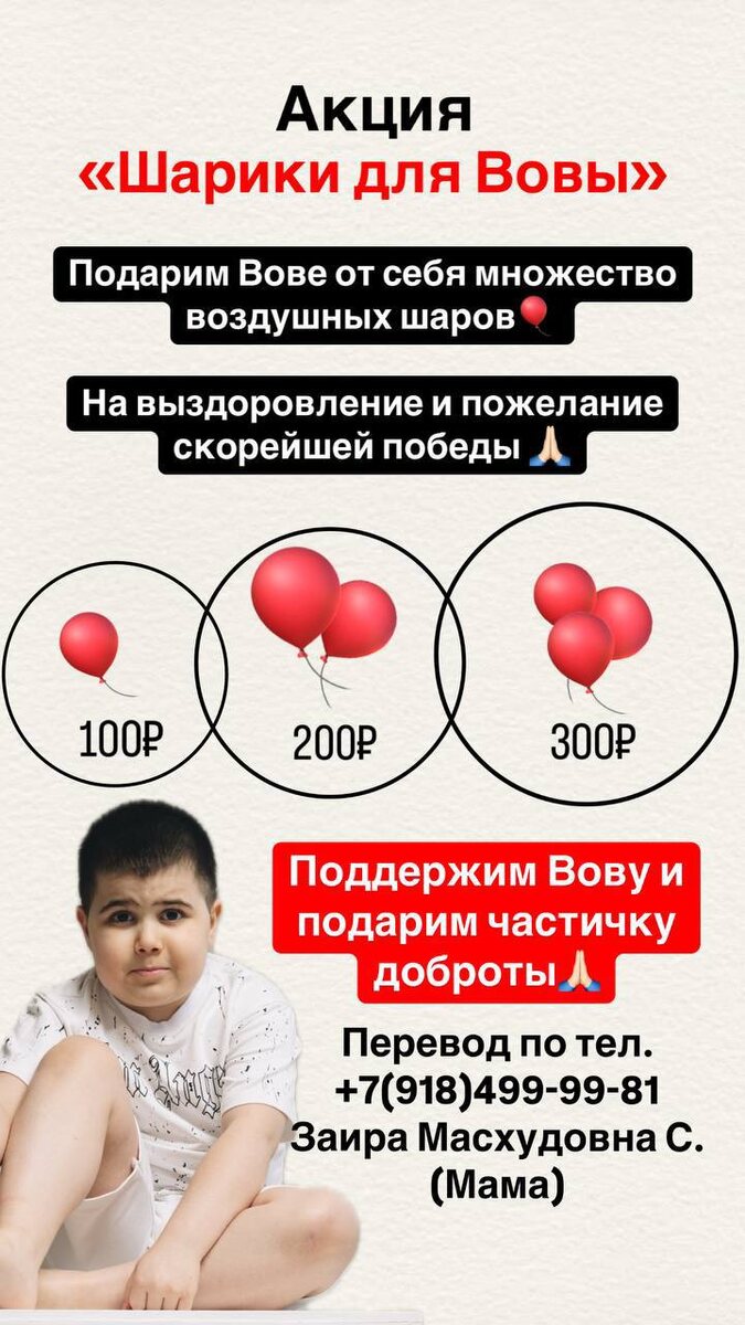 1 июня- день защиты детей 👼 И символом этого дня являются воздушные шарики🎈 Сегодня у каждого из нас есть возможность поддержать Вову в его борьбе и помочь ему оказаться еще ближе к победе🙌🏻 Пусть все дети будут здоровы и у всех будет счастливое детство ♥️ Перевод по номеру тел.+7(918)499-99-81 Заира Масхудовна С. (Мама) Спасибо за поддержку 🙏🏻