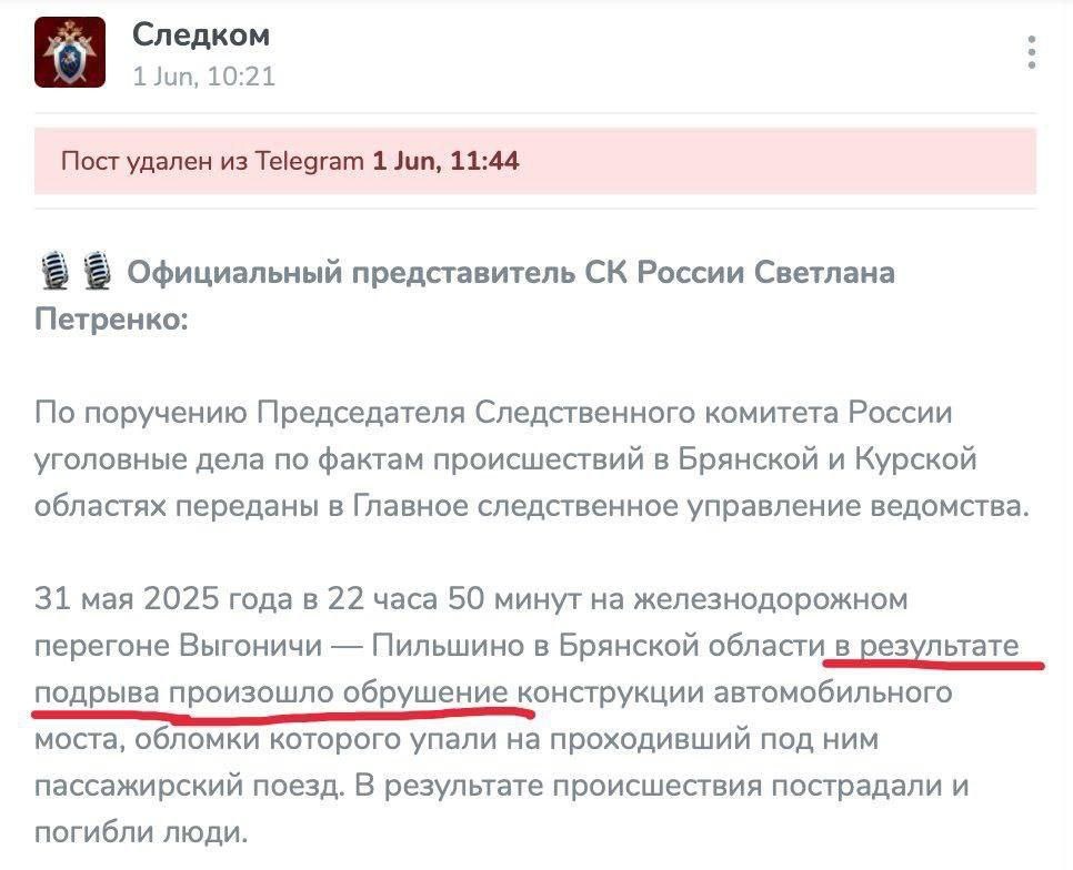 Следком РФ удалил пост, в котором назвал инцидент в Брянской области «подрывом» Теперь в официальном заявлении написано «обрушение конструкций» Сами по себе, на всех 3х мостах...