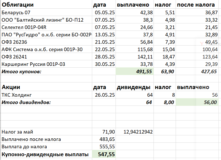 С первым днем лета! Весна закончилась, а значит, пора подводить итоги последнего месяца весны. И начну я с инвестиций. В мае было большое количество пополнений: только с активного дохода я положила на брокерский счет 13500. Напомню, что так я возвращаю себе долг за зубы, и заодно понемногу увеличиваю свой пассивный доход. Конечно, на эти деньги, а также на подарки брокера, купоны, дивиденды и даже одно закрытие облигации было куплено много всего, но так как я стала вести еженедельную рубрику с обзором своих инвестиционных покупок, подробно здесь описывать их больше не буду. Скажу только, что у меня на брокерских счетах на момент написания этой статьи 109634 рубля; сумма наконец-то стала шестизначной принимаю поздравления! Конечно, у меня в портфеле не только облигации и дивидендные акции, но в этом году решила сделать акцент именно на них. Дело в том, что мои пополнения портфеля достаточно невелики, и дополнительные реинвестирования средств могут оказаться очень кстати. К тому же, поле