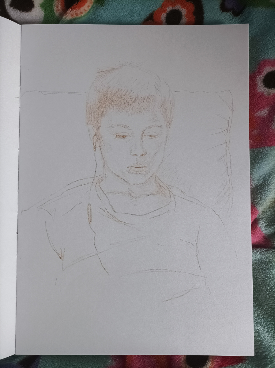 Приветствую!Поговорим сегодня о набросках.Набросок это краткосрочный рисунок небольших размеров, в котором минимумом изобразительных средств переданы основные характеристики натуры. Они выполняются различными материалами:графит.карандаш,сангина ,сепия,тушь,в общем,чем душе угодно. Чаще всего делаются с натуры,делают по памяти и по воображению.Задачи и цели у набросков разные:просто тренировка худож.способностей(развитие глазомера,пластики и т.д),также,например в путешествиях, это может быть своего рода заметка, рисунок на память ,и безусловно для поиска идей ,для решения каких-нибудь композиций. История этого наброска. Купила себе в СПб фантастический альбом,с классной бумагой, такой весь толстенький.....как будто в нём должны быть только одни шедевры....) Сижу я в обнимочку с этим альбомом и вижу перед собой не особо часто щевелящегося ребёнка,но как только я сказала волшебные слова:" сиди как сидишь",началось...тысяча сто пятьдесят три движения в секунду... Конечно,профессио