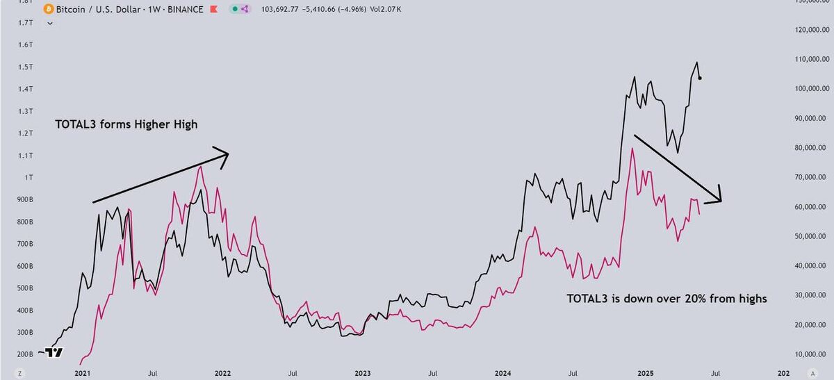 Вы всё ещё верите в фрактал 2021 года? Посмотрите на альты. В продолжение предыдущего поста - на графике видно гораздо больше, чем просто отклонение TOTAL3 (капитализация альткоинов без BTC и ETH) от цены биткоина. В 2021 году: — Альты опережали BTC — TOTAL3 дал higher high — Это был сигнал: аппетит к риску зашкаливал, началась массовая эйфория А теперь: — BTC обновил хай — Альты — нет — TOTAL3 минус 20% от пиков — Аппетит к риску вялый — Эйфория не пришла Что это значит? Это не фаза распределения. Это не «вот-вот альты полетят». Это фаза, где ликвидность концентрируется в BTC, потому что рынок не готов к риску. Маркетмейкеры — это не романтики. Они не начнут пампить мусор, пока нет желающих его скупать. А сейчас желающих — немного. Значит, нужно либо дождаться новых нарративов, либо продолжать аккумулировать в биткоине. Хотите, сделаю серию постов: — как читать TOTAL3 — как распознать рост аппетита к риску — какие метрики показывают, что начинается настоящий альтсезон Ставьте