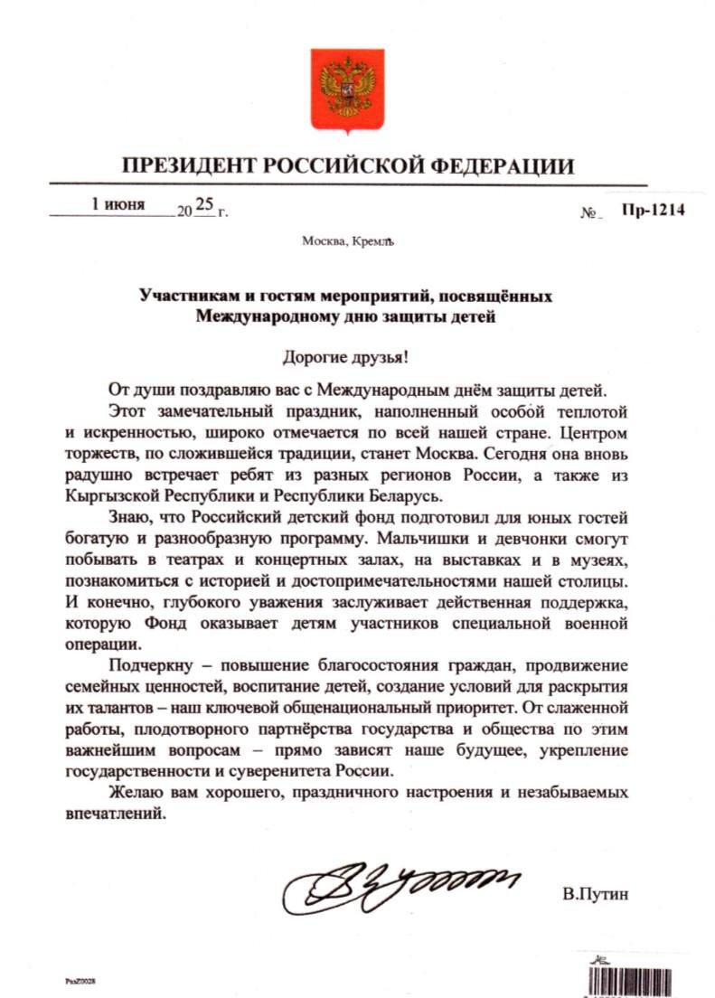 π·πΊΠΠ»Π°Π΄ΠΈΠΌΠΈΡ ΠΡΡΠΈΠ½ ΠΏΠΎΠ·Π΄ΡΠ°Π²ΠΈΠ» ΡΡΠ°ΡΡΠ½ΠΈΠΊΠΎΠ² ΠΈ Π³ΠΎΡΡΠ΅ΠΉ ΠΌΠ΅ΡΠΎΠΏΡΠΈΡΡΠΈΠΉ Π ΠΎΡΡΠΈΠΉΡΠΊΠΎΠ³ΠΎ Π΄Π΅ΡΡΠΊΠΎΠ³ΠΎ ΡΠΎΠ½Π΄Π°