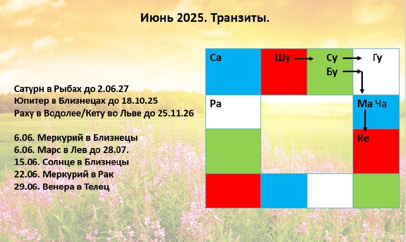 Астро-события Июня 2025. 💫6.06. Меркурий переходит в свой знак Близнецы. Это сильное положение для Меркурия, значит вся деятельность с ним связанная получает поддержку. Это образование, коммуникации, связь, бизнес, торговля, аналитика, писательство, интеллектуальная деятельность в целом. Меркурий соединяется с Юпитером и находится под влиянием Раху в Близнецах, обе эти грахи способствуют расширению, отличное время для налаживания связей с иностранцами, учебы и исследований, поиска нестандартных подходов. И в то же время остерегайтесь мошенников и отслеживайте в себе подобные тенденции, соединение Меркурия с Юпитером даёт такую склонность, а уж с Раху – наверняка. 💫6.06. Марс переходит в Лев до 28.07. Самый ожидаемый переход, Марс в Раке изрядно поднадоел, ожидаем прилива сил и мотивации на активные действия, особенно все те, кто в гороскопах сильно зависим от Марса, восходящие и Лунные Скорпионы, Овны, а также проживающие период Марса. Кету во Льве возможно тоже даст Марсу какие-то