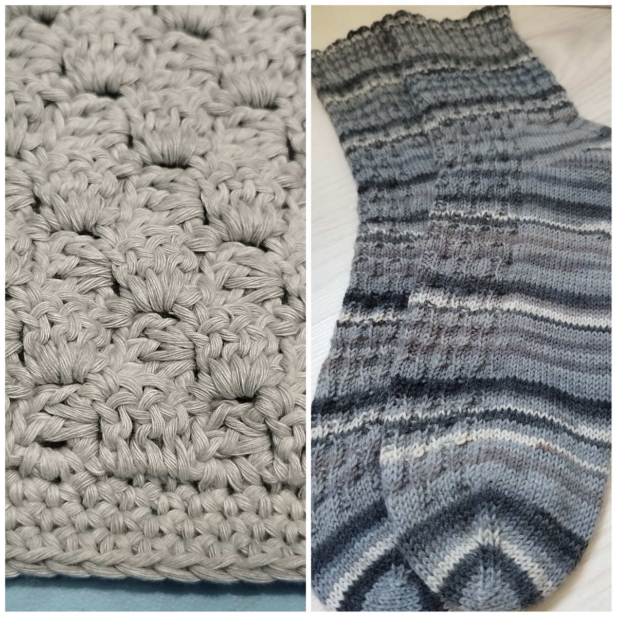 В мае на меня, видимо, напала хандра и я вязала в основном серые изделия. В июле у моего папы будет день рождения (он один из моих родных, кто носит носки вязаные мною. Мама бережёт, не носит) и я связала для него носки. Носки 42-43 размера . Вес 67 го. Пряжа турецкий носочный сток, куплен в магазине Merino heart ( теперь этот магазин есть на ВБ). Я подбирала секции, но в пряже есть непрокрасы и несовпадения в тонах. У меня такой пряжи был один моток, я его размотала на 2 одинаковых. Вязала от мыска методом magic loop, на спицах 2,25, пятка от скуки версия 1.0, закрытие с двойным провязыванием петель. Так же я впервые решила попробовать связать коврик методом с2с. Пряжу я покупала на Авито. 100% хлопок с неизвестным метражом, крючок 3.0 Коврик связан от угла. Итоговый размер получился 47*72, вес 300гр. Я полностью вывязала купленную пряжу. Есть ещё одно изделие готовое в плане вязания, но не готово к использованию. Я связала кардиган, это был мой долговяз. Но так как не провед