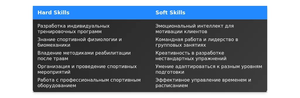 Пример 3: Упоминание "разработка индивидуальных программ тренировок" подчеркивает важность креативного подхода и знаний в области физиологии.