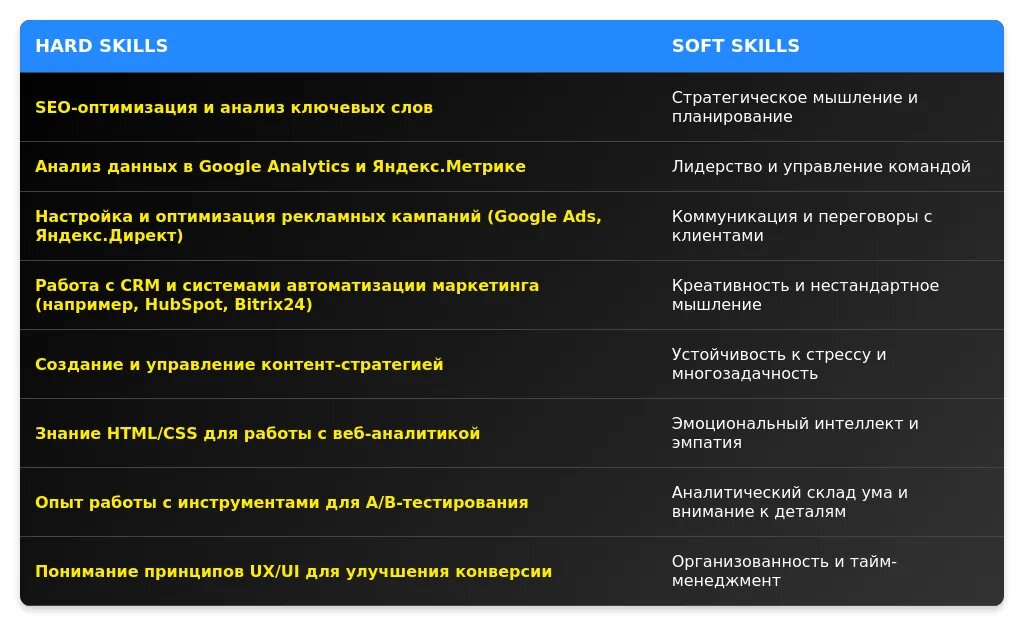 - Делайте акцент на навыки (SEO, SMM, аналитика, контекстная реклама).
