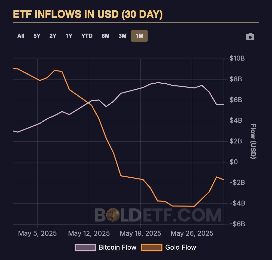 πΈΠ ΠΌΠ°Π΅ ΠΏΡΠΈΡΠΎΠΊ ΠΈΠ½Π²Π΅ΡΡΠΈΡΠΈΠΉ Π² Π±ΠΈΡΠΊΠΎΠΈΠ½-ETF ΠΏΡΠ΅Π²ΡΡΠΈΠ» ΠΏΡΠΈΡΠΎΠΊ ΠΈΠ½Π²Π΅ΡΡΠΈΡΠΈΠΉ Π² Π·ΠΎΠ»ΠΎΡΡΠ΅ ETF.
