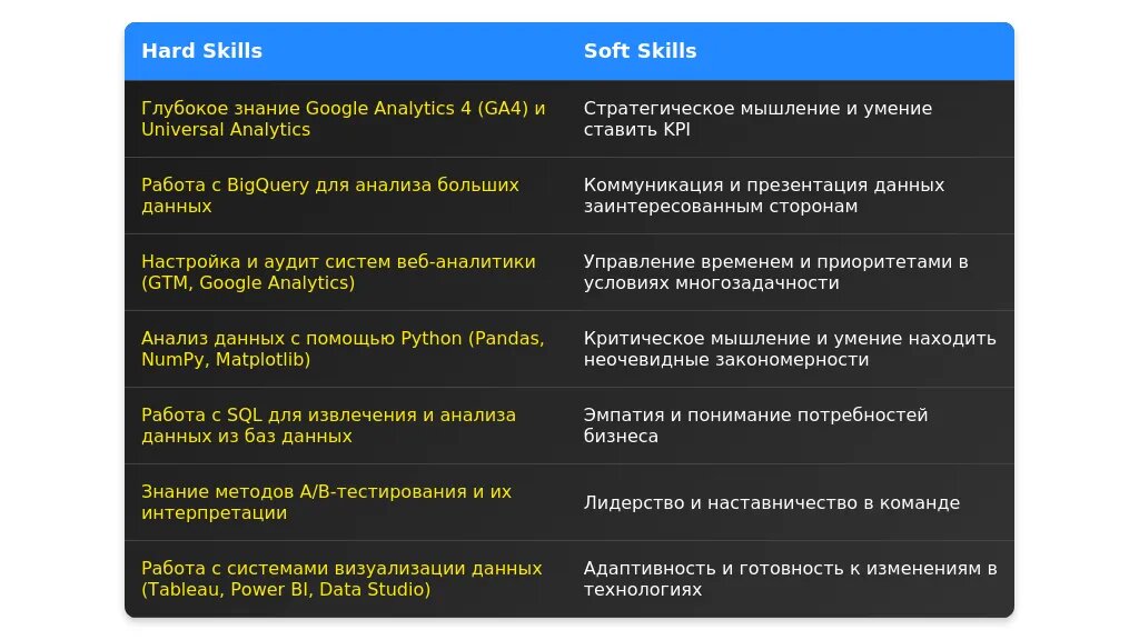 До адаптации: "Google Analytics, SQL, Python, Tableau." Нет приоритетов.