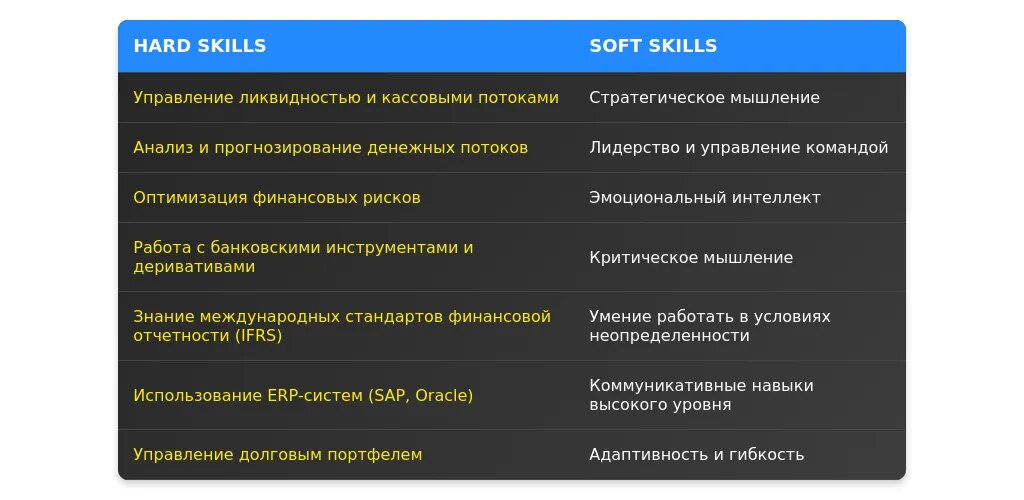 Ключевые навыки (анализ денежных потоков, управление банковскими отношениями).