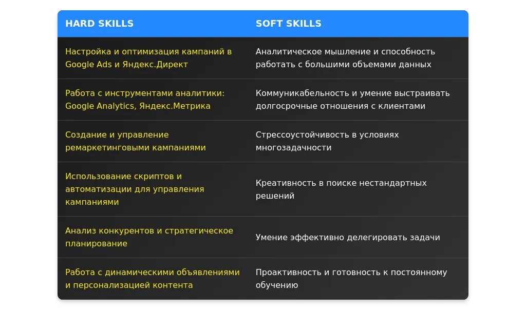 После: Навыки оптимизации рекламных кампаний, анализа данных, A/B тестирования, работы с Google Ads и Яндекс.Директ.