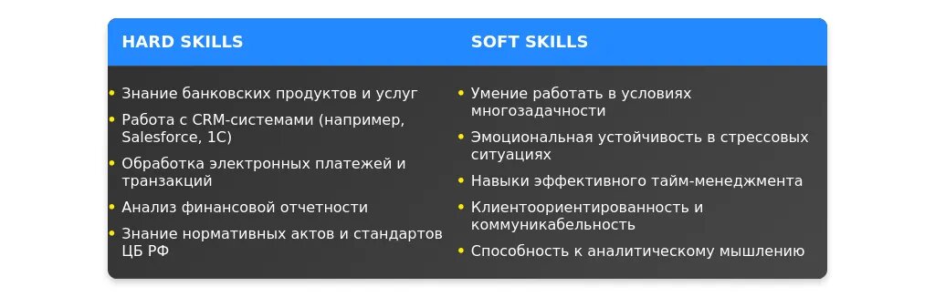 После адаптации: "Опыт работы с CRM-системами, знание банковских операций, навыки работы с Excel."