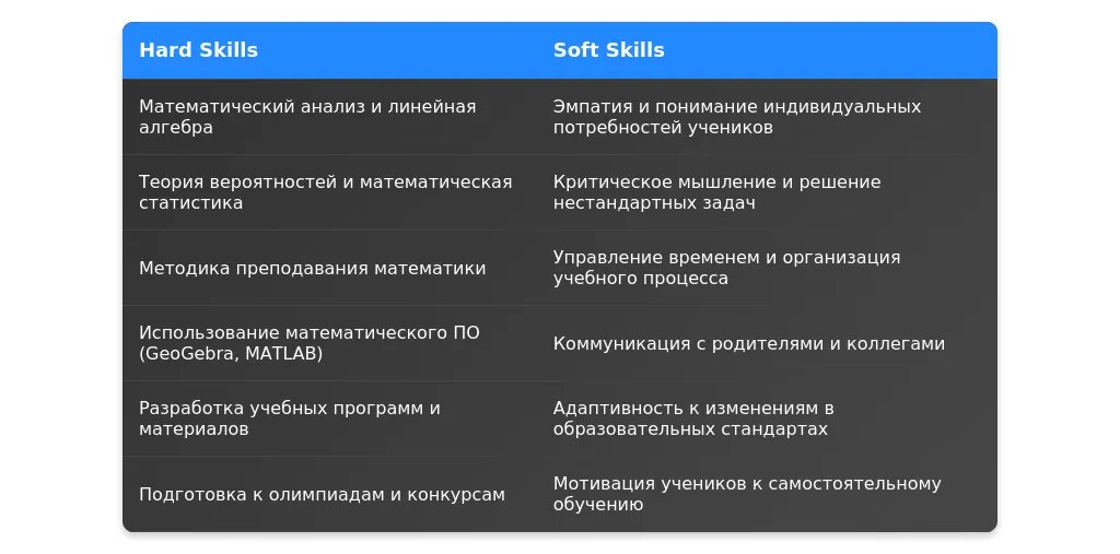После адаптации: "Знание математики, опыт подготовки к ОГЭ/ЕГЭ, работа с интерактивными досками, опыт в инклюзивном образовании."