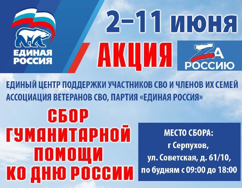 🇷🇺 С 2 по 11 июня местное отделение Партии «Единая Россия» совместно с Единым Центром поддержки участников СВО и членов их семей, Ассоциацией Ветеранов СВО Г.о. Серпухов проводит акцию по сбору гуманитарной помощи в преддверии Дня России под лозунгом «Zа Россию». ✅ Приглашаем вас принять участие и помочь нашим бойцам. Гуманитарную помощь можно приносить на площадку общественной приёмной партии по адресу: г.о. Серпухов, улица Советская, д. 61/10. В данный момент для наших защитников особенно необходимы: • Нижнее белье; • Лекарственные препараты; • Влажные салфетки; • Продукты длительного хранения.