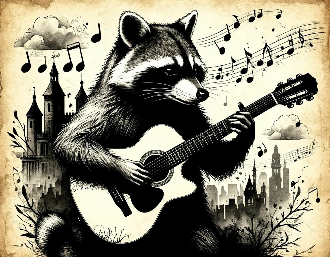 An elegant ink illustration of an anthropomorphic RACCOON playing a GUITAR, whose silhouette merges with a detailed CITY with rooftops, clouds and fragments of notes. Subtle flow without unnecessary floating elements. The background is ANTIQUE paper, clean lines of the staff and delicate musical notes. The palette is BLACK, GREY and FADED YELLOW. A balanced composition combining music, architecture and nature in a harmonious poetic style.