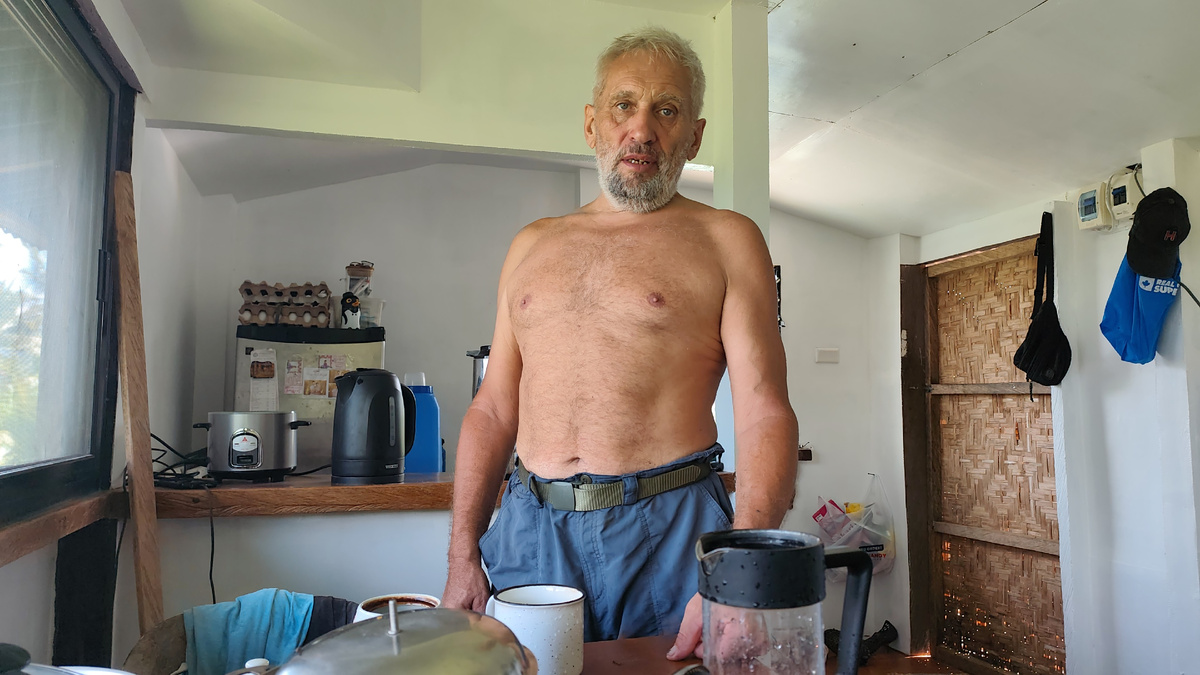 Здравствуйте! Вот и всё. Ходи вонючий. Не, это не шутка. Просто так день пошёл. С утра копал. Котлован. Ровный, как настроение. Надо было ещё съездить за топливом для пилы, но подумал — поем сначала. Поел. Как всегда — рис и адобо из банки. Фигня, конечно, но свинину вчера съели, а сегодня Мумай с Ваней уехали в Батахон Дако, дела. Завтрак филиппинский, значит — скромно, но честно. Поел, сел переваривать, как вдруг — ливень. И гроза. Не просто «покапало», а так, чтоб всё сдувало и котов с места срывало. Петрович, кот, сиганул ко мне на колени. Он прямо с лежанки своей мне на колени прыгнул — испугался. Видели же его лежанку, красные губы, "поцелуйчиком" зову. А тут — бах! молния, грохот, и он ко мне, свернулся в комочек. Сидим. Я в телефоне, он в тишине. А мне ехать надо. Канистра — в бабуйхаусе, масло — в домике, где сплю. Собрался, проскочил между каплями, взял канистру, в рюкзак её, поехал к своей комнате, а там — потоп. Окно открыто было, сетка от комаров стоит, но толку с неё,