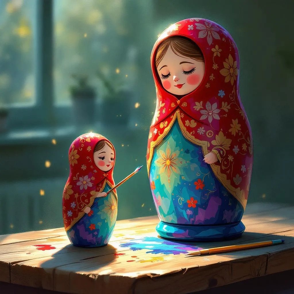 Представьте классическую русскую матрёшку. Большая расписная фигура — мать. Внутри, чуть меньше - дочка. В идеале внутренняя кукла постепенно вынимается и раскрашивает себя в те цвета, которые выбирает сама. Но если крышка заедает, матрёшка-дочка остаётся внутри, с одними и теми же узорами. Отсюда ощущение: ты вроде бы «есть», но твоё лицо и твой орнамент принадлежат кому-то другому.