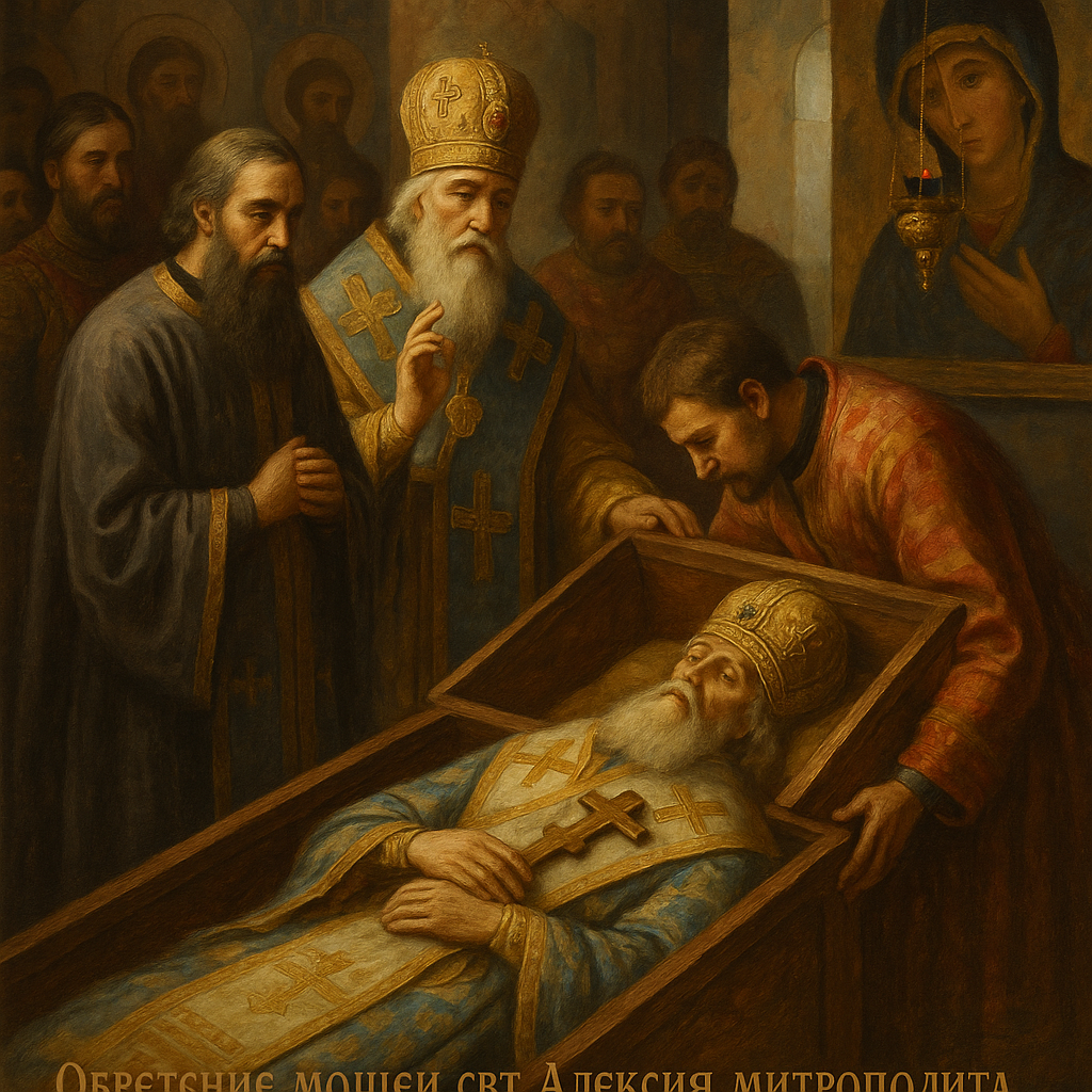 Обретение мощей святителя Алексия, митрополита Киевского, Московского и всея Руси, произошло в 1431 году и стало значимым духовным событием для Русской Православной Церкви. Это событие не только засвидетельствовало посмертную святость архипастыря, но и укрепило авторитет Русской митрополии в период становления Московского государства как центра православия на Руси. Святитель Алексий (в миру — Елефе́рий Бяконт) родился около 1296 года в знатной боярской семье в Москве. С юных лет он стремился к духовной жизни, и уже в зрелом возрасте принял монашество в Богоявленском монастыре, где отличался строгим и подвижническим образом жизни. В 1354 году он был поставлен на митрополичий престол Киевский и всея Руси, при этом резиденция митрополита уже фактически находилась в Москве. Алексий был одним из первых митрополитов, активно участвовавших в государственной жизни Московского княжества. Он был советником князя Симеона Гордого, а затем — князя Дмитрия Донского. Святитель прославился своими чуде