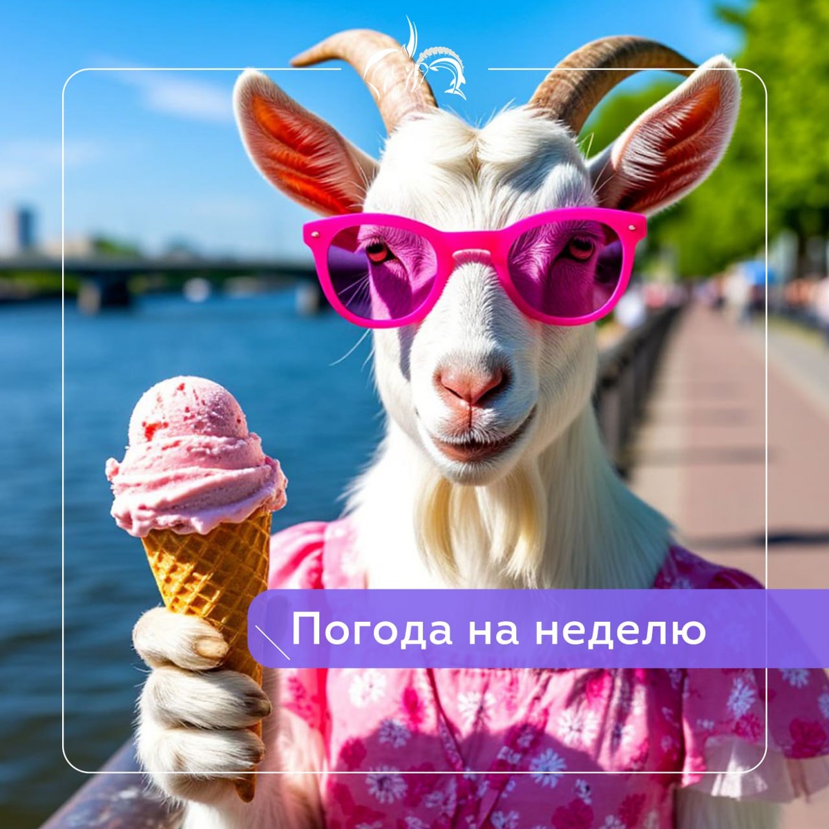 Погода на неделю 🌧 Июнь встречает нас дождями! Коза подбирает новый сарафан для прогулок по набережной, но не забывает прихватить зонт, на всякий случай. По прогнозам синоптиков средняя температура составит +23 градусов днем и + 13 градусов ночью. Порывы ветра будут достигать 3 м/с. В понедельник, субботу и воскресенье возможны осадки! ☁️ ✅ Подписаться на Козу и Стерлядь