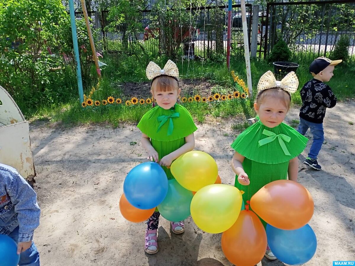 Ход развлечения: Под музыку "Вместе весело шагать" дети заходят на площадку и встают в круг. Воспитатель: — Дети, сегодня 1 июня — праздник для всех детей, живущих на планете, а также и начало лета. Мы теперь с вами будем гулять утром, днём и вечером. Каникулы у школьников начались, и у нас тоже! В День защиты детей папочки и мамочки стараются устроить своим детям праздник. Вместе отправляются в парк на разные аттракционы, угощают мороженым. В парке звучит весёлая музыка, на площадке появляются весёлые девочки-артистки и зовут играть. Воспитатель: Здравствуйте, девчушки-веселушки! — Приглашаем вас на праздник. Девчушки: Здравствуйте детишки Девчонки и мальчишки! Мы сегодня к вам пришли, И подарки принесли. 1 Веселушка поёт песенку: — Разные, разные: голубые, красные, Жёлтые, зелёные, воздушные шары. Посмотрите, какие у меня шарики, давайте посчитаем и с ними поиграем! (Веселушка раздаёт девочкам шарики) Девочки выполняют упражнения с шарами. 2 Веселушка: Хочу с мальчиками поиграть. Я н