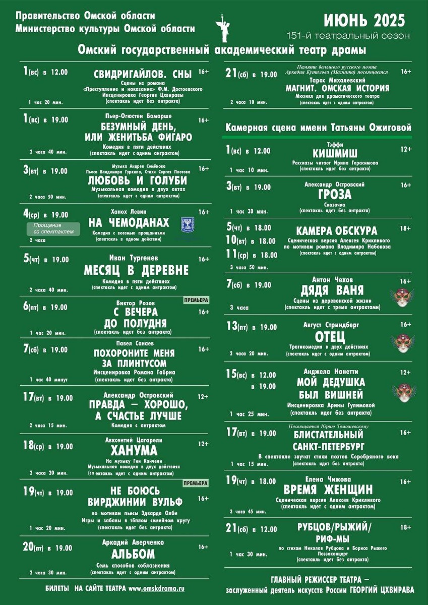 Дорогие зрители! Поздравляем вас с наступлением долгожданного лета! До закрытия 151-го театрального сезона в Омском академическом ровно месяц. Приглашаем вас увидеть премьеры сезона и полюбившиеся постановки в июне! Сохраняйте афишу и выбирайте спектакль для просмотра на свой вкус! Билеты вы найдете в театральных кассах и на сайте omskdrama.ru. Все спектакли участвуют в программе "Пушкинская карта". #омскдрама151