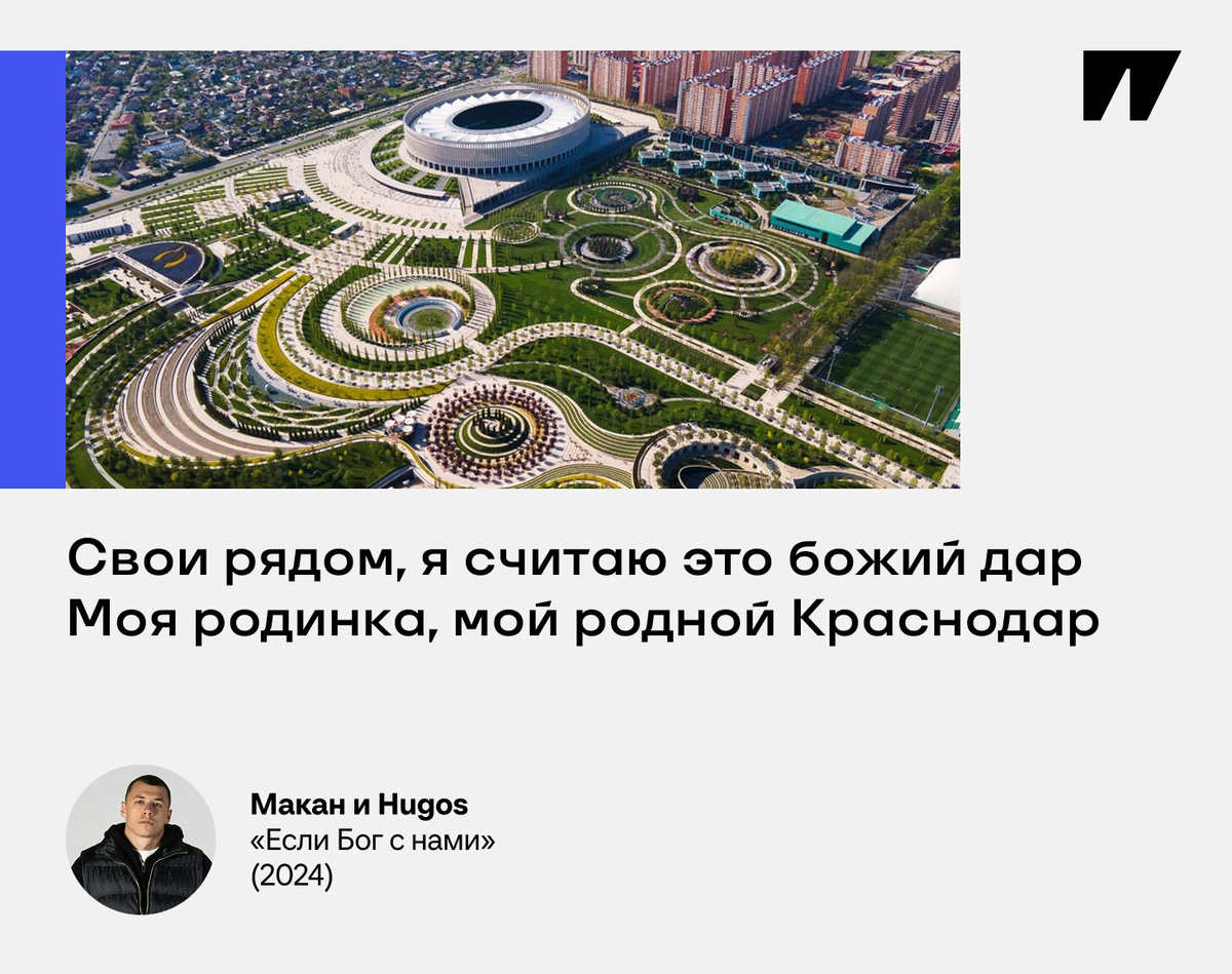 Макан родился и рос в Москве, но часто записывается с парнями с юга России. Рэпер Hugos (это он автор строчки) периодически записывает для телеграма кружки из зала вольной борьбы. Если вам важно, чтобы слово «Краснодар» произнес именно Макан, то оно есть во вступлении, похожем на амбициозный маршрут: «Москва, Ростов, Краснодар, Ростов, Москва, е…». Кстати, так выглядел график «Ростова» с 6-го тура по 8-й».