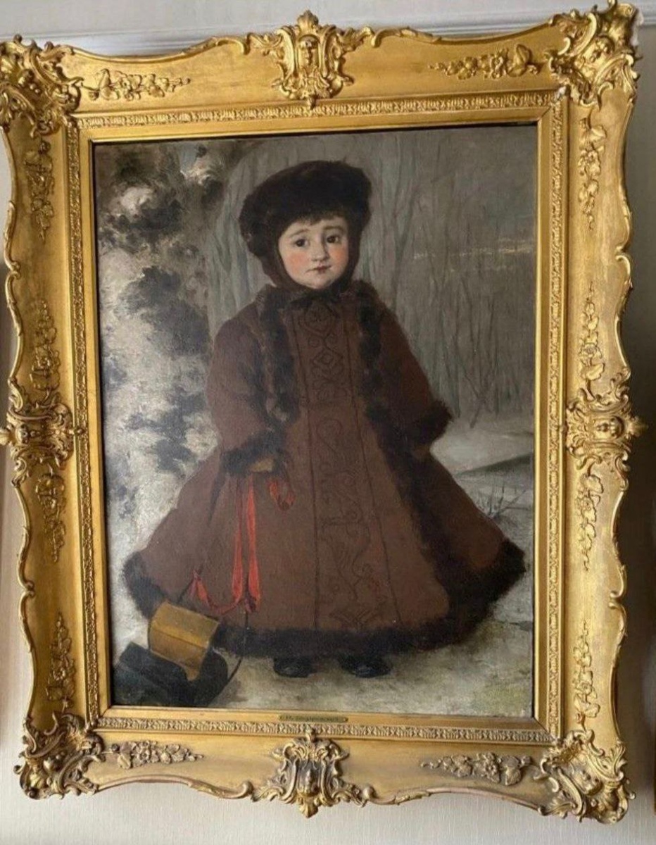 Перед нами большой портрет конца 19 века. Лицевая подпись Н.К. Бодаревского. Всё родное – подрамник, рама - всё без реставрации. На фоне темного зимнего неба и заснеженного озерного ландшафта у ствола старой березы изображена маленькая круглоликая девочка. Ее большие глаза смотрят на нас немного сверху вниз, но вместе с тем по-детски открыто. Девочке не больше 3-х лет. Шубка овчинная с опушкой, очень добротная, с красивой вышивкой на груди и запахом. Точно такая же качественная овчинная шапочка с пододетым под него платком на манер детской моды самого конца 19 века. На ножках валеночки с галошами, что торчат из-под длинной шубки. В правой руке она держит красную атласную ленту, привязанную к игрушечным саночкам.