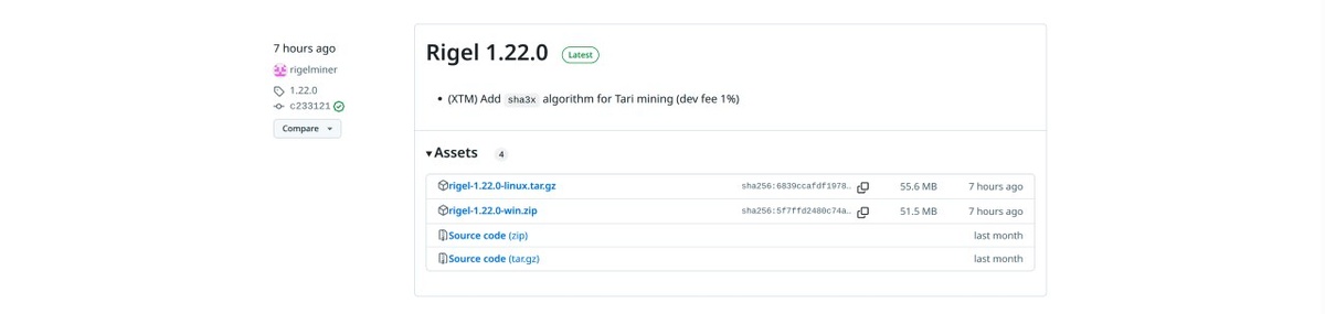 Rigel 1.22.0 — Добавлен SHA3 xалгоритм для майнинга Tari (комиссия разработчика 1%) Скачать