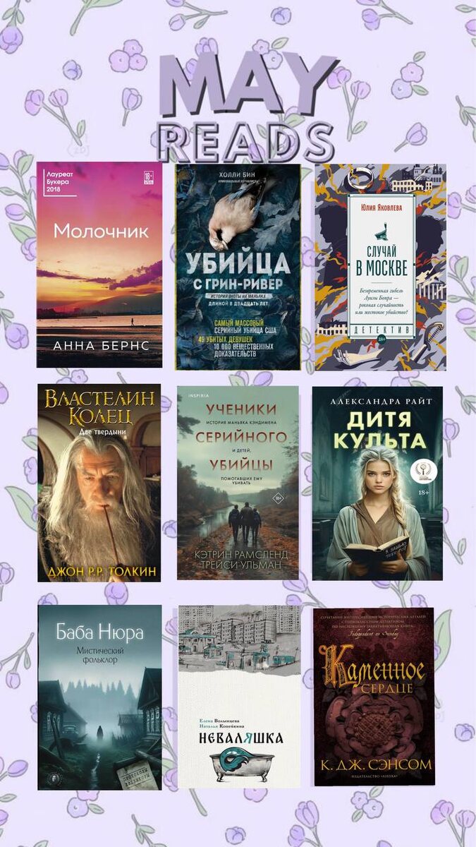 🌿🌿🌸🌸🌿🌿🌸 🌸🌱💖🌿🌸 🎀🌿🌸🌸 В мае я не сбавляла обороты и сравнялась с апрелем 📚 1️⃣ Молочник 4/5 2️⃣ Убийца с Грин-Ривер 5/5 3️⃣ Случай в Москве 4/5 4️⃣ Ученики серийного убийцы 3/5 5️⃣ Властелин колец — Две твердыни 5/5 6️⃣ Дитя культа 4/5 7️⃣ Баба Нюра 3/5 8️⃣ Неваляшка 3/5 9️⃣ Каменное сердце 5/5 1️⃣🩷 Театр тьмы 4/5 1️⃣1️⃣ Ненадежный свидетель 4/5 1️⃣2️⃣ Пир теней 3/5 1️⃣3️⃣ Соседская вечеринка 3/5 1️⃣4️⃣ Пустые зеркала 4/5 1️⃣5️⃣ Невеста смерти 4/5 1️⃣6️⃣ Искупление 5/5 1️⃣7️⃣ Властелин колец — Возвращение короля 5/5 Июнь уже не будет таким плодотворным, но я буду стараться, несмотря на огромную загруженность. Делитесь своими книжными итогами. Уже составили план книг на лето? #книги #книжныеитоги