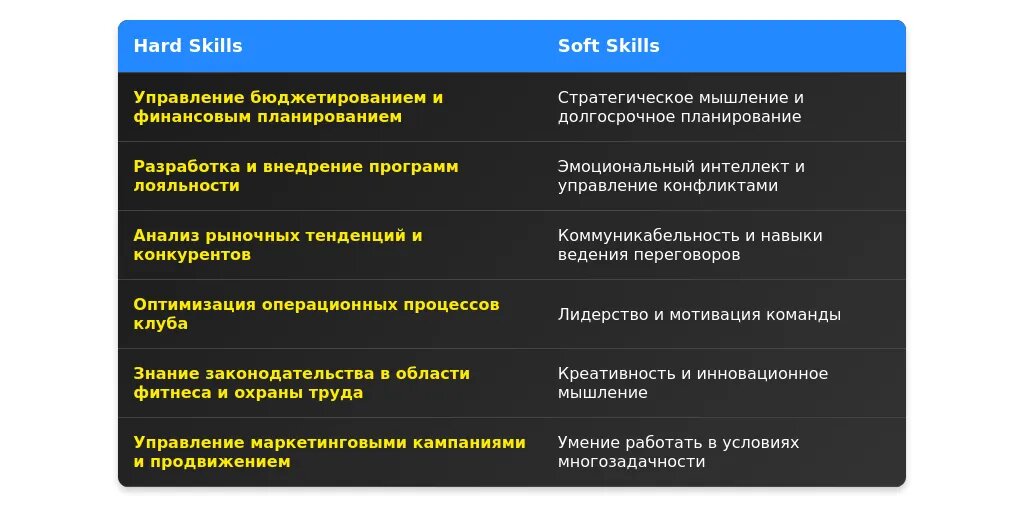 До адаптации: "Управление коллективом, работа с клиентами, знание фитнес-трендов."