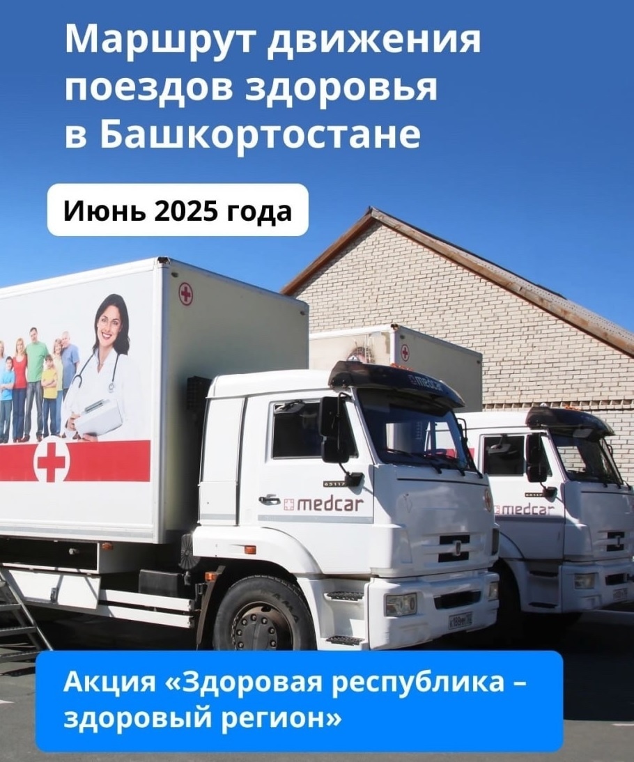 В Башкирии в рамках акции «Здоровая республика – здоровый регион» определили муниципалитеты и населенные пункты, где побывают «поезда здоровья». По сообщению пресс-службы Минздрава республики, в июне 2025 года «поезда здоровья» побывают в Абзелиловском, Архангельском, Бакалинском, Буздякском, Бурзянском, Дуванском, Дюртюлинском, Илишевском, Ишимбайском, Калтасинском, Кушнаренковском, Мечетлинском, Стерлибашевском, Стерлитамакском и Учалинском районах. «Напоминаем, обследование проводится бесплатно. Записываться к специалистам не нужно – прием проводится в порядке живой очереди. Главное, взять с собой паспорт и полис ОМС», - отметили в ведомстве. Фото: пресс-служба Минздрава РБ.