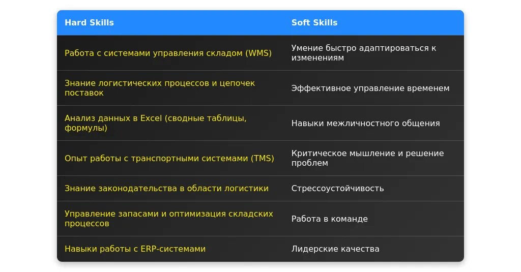 Обязательные навыки для этой профессии включают знание логистических процессов, работу с системами управления складом (WMS) и аналитическими инструментами.
