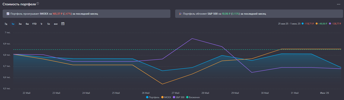 Май выдался сложным. С одной стороны сбылся некоторый риск связанный с детьми, что потребовало взять "кучу" денег и вытащить её из инвестиций. Тут можно было бы порассуждать, что это одна из причин инвестировать независимо от финансового состояния. Без некоторой соломки на чёрный день было бы очень плохо. С другой стороны я всё же развернул запланированную стратегию пружинки в полной мере и теперь есть на что "Будем посмотреть". А что бы смотреть могло быть интересней снова включили и настроил сервис сноубол. ИИС умер, да здравствует ИИС!