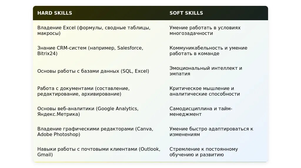 - Делайте акцент на базовых технических навыках (MS Office, Google Workspace).
