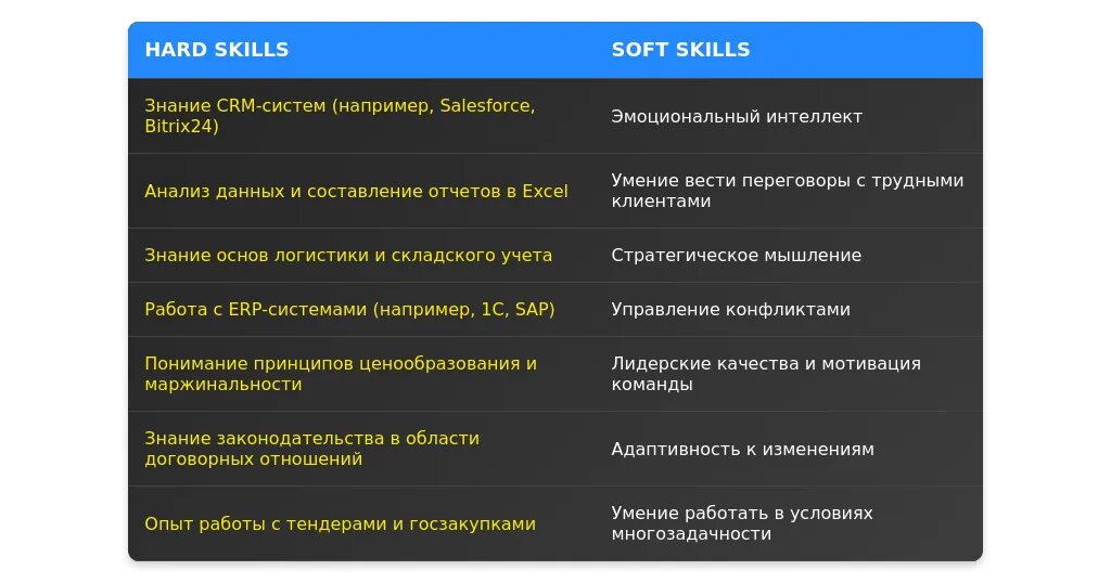 После адаптации: "Навыки ведения переговоров, работа с CRM-системами (Salesforce, 1С), аналитические навыки."