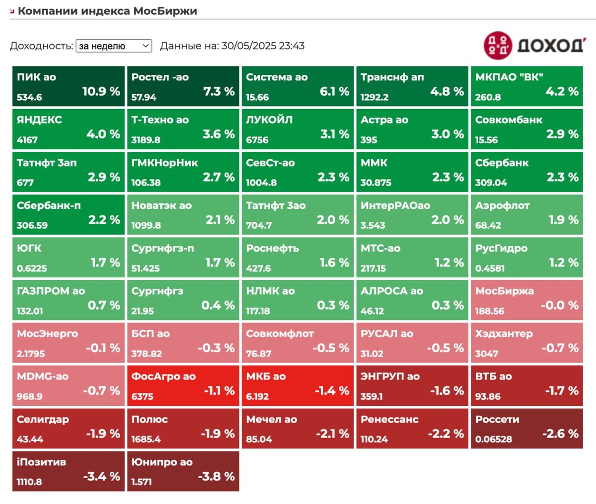 Индекс Мосбиржи за неделю: 2,12%, с начала года: -1,88%