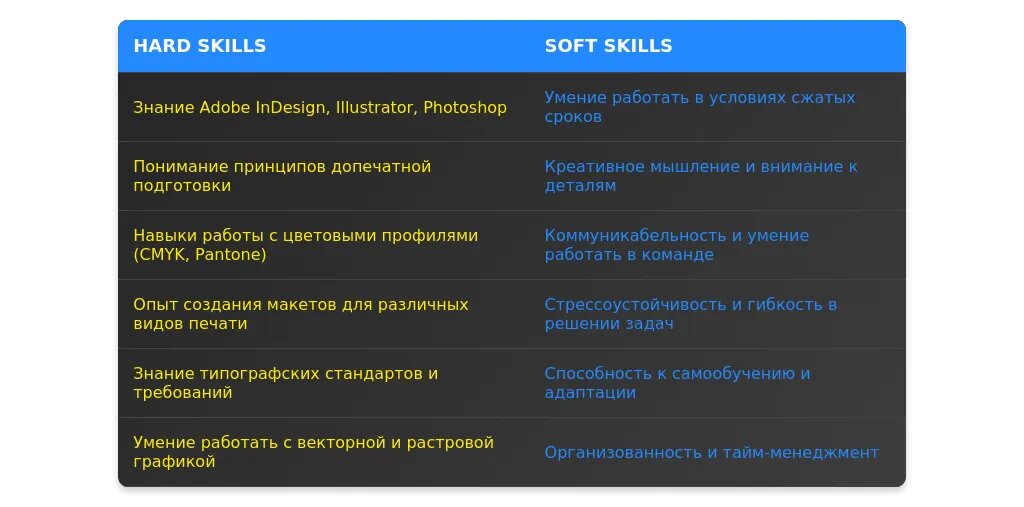 Soft Skills — это личные качества, которые помогают эффективно работать в команде и справляться с задачами. Вот топ-10 для дизайнера полиграфии: